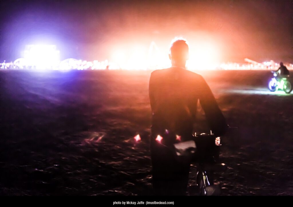 where none should be, out beyond the Man, beyond the Temple, beyond everything really, all the way to the Eastern perimeter fence, the closest-possible point to the eventually coming sun, but now that one far away spot in the dark empty desert had been transformed into an insiders, all-nighters, arms-in-the-air revel, forming one final spun-off galactic arm of us, the furthest extension of our raving tribe’s mobile never-ending party.
